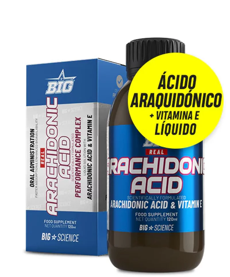 REAL ARACHIDONIC ACID di BIGscience è una nuova formulazione di acido arachidonico e vitamina E in un nuovo formato liquido per somministrazione orale, che aiuta a regolare il processo di infiammazione e crescita muscolare in risposta ai danni meccanici ai muscoli causati dall'allenamento.